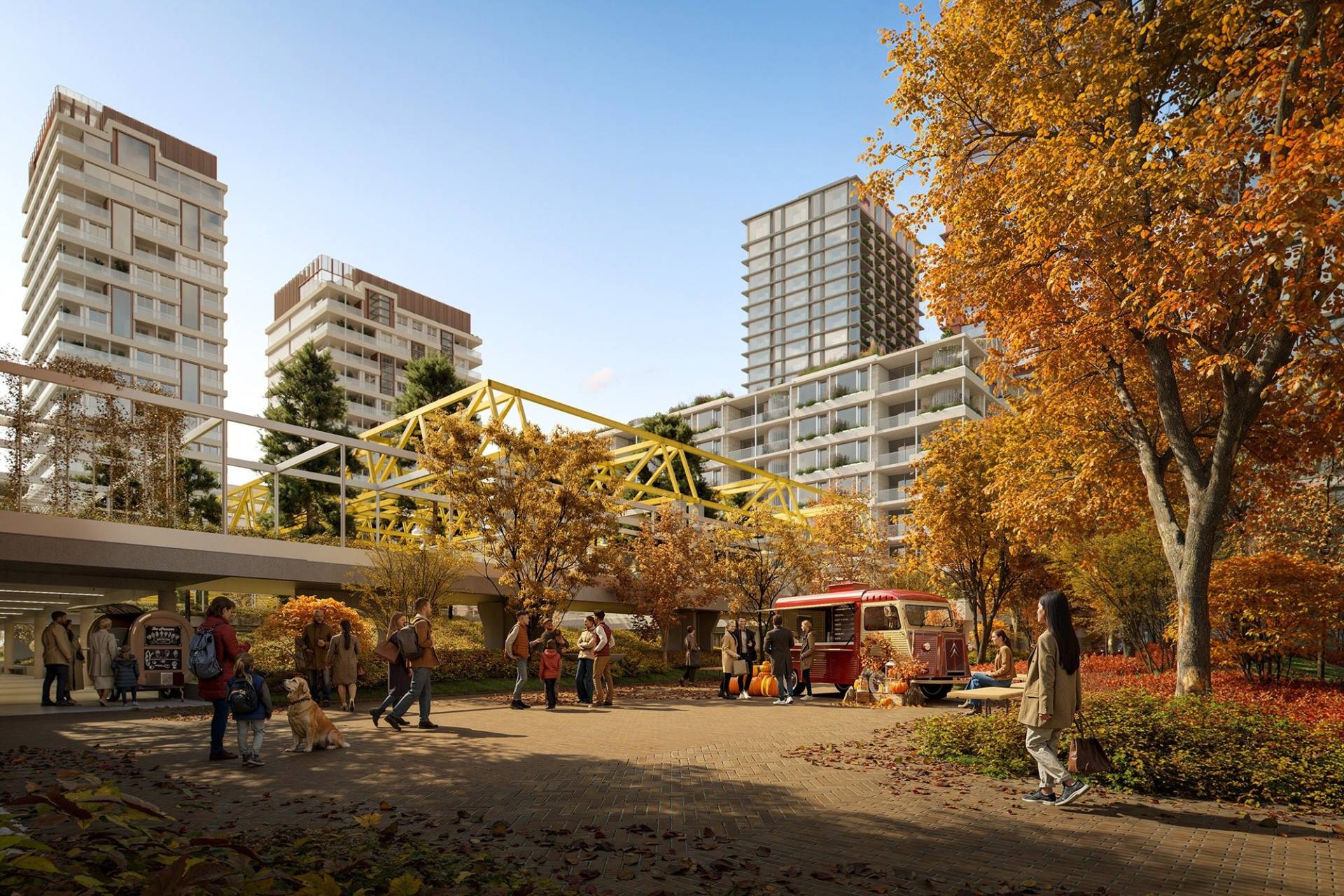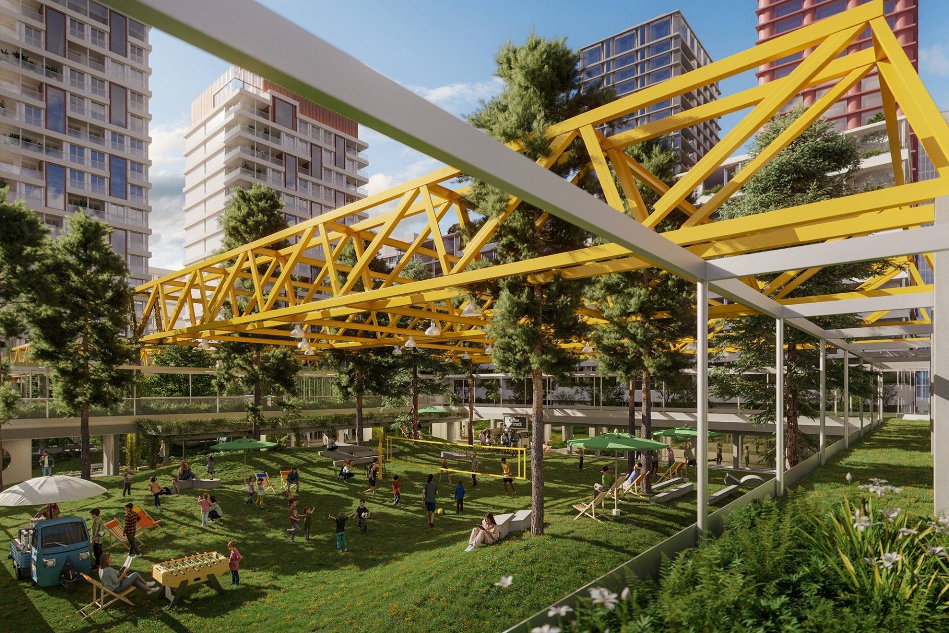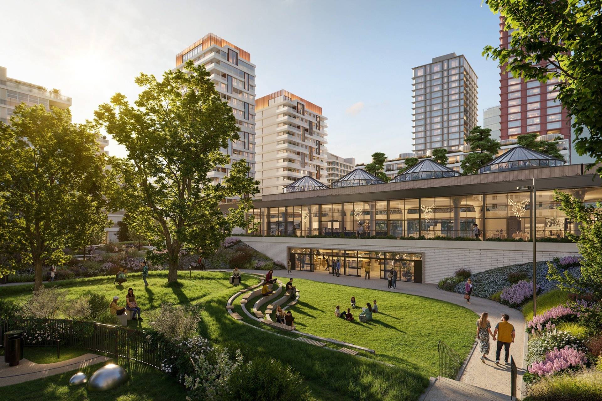 Gatunki odporne na warunki miejskie dobrano tak, aby były atrakcyjne przez cały rok i stanowiły pokarm oraz schronienie dla zwierząt i owadów. Architekci krajobrazu zaprojektowali tutaj również polanę z wkomponowanym w teren amfiteatrem, placyk z oczkiem wodnym i zadaszenia z kobaltowych słupów nawiązujące do modernistycznej historii drukarni. Wśród zieleni powstanie też przestronny plac zabaw z bogatym programem dla dzieci małych i dużych. Będzie tu piaskownica, zjeżdżalnia, trampolina, karuzela, bujaki, drabinki, zabawki integracyjne i miejsca odpoczynku dla rodziców. Każdy odwiedzający to miejsce będzie mógł spacerować siecią meandrujących alejek, które pozwolą na swobodną eksplorację.